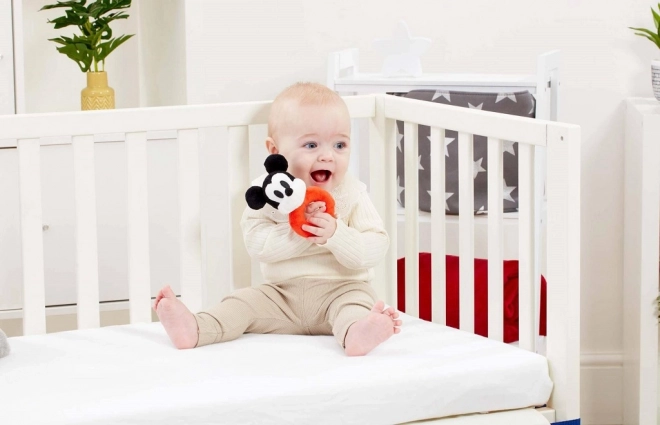 Plys-ranglen MICKEY MOUSE i den populære sort–hvid–røde kombination er en skøn ledsager til de første opdagelser af verden. De bløde materialer er behagelige at røre ved, mens den diskrete raslen motiverer barnet til bevægelse, rysten og udforskning.