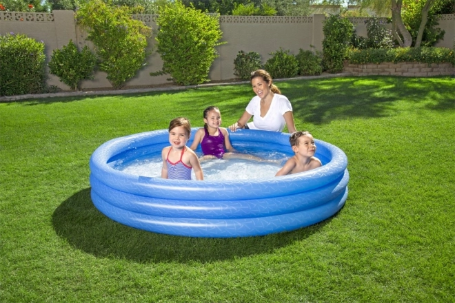 Oppusteligt børnebassin med dimensionerne 183x33 cm passer nemt i din have eller på terrassen og er let at fylde med vand. Takket være de tre runde lag er bassinet stærkt og stabilt, ideelt til en sikker leg for dine små. Bassinet inkluderer et reparationssæt for hurtig reparation af eventuelle små skader.