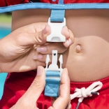 Justerbare stropper og et robust plastspænde holder vesten sikkert på plads, samtidig med at de giver bevægelsesfrihed og gør den let at tage på og af.