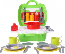 Dette køkkensæt indeholder alt, hvad der er nødvendigt for dine børns kulinariske idéer. Det er let at transportere takket være taskedesignet, så du kan stille det op og lege hvor som helst det er nødvendigt. Sættet er designet til at udvikle børns fantasi og hjælpe dem med at genkende objekter, mens de har det sjovt.