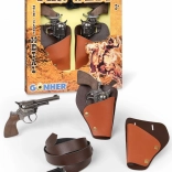 Dette metalsæt med cowboyrevolvere giver både børn og voksne klassisk westernstemning. To kvalitetsrevolvere i metal med fælles hylster er lette at bære og ligger godt i hånden. Takket være lydeffekten virker de realistiske, samtidig som de er sikre – uden skarpe skud og uden patroner.