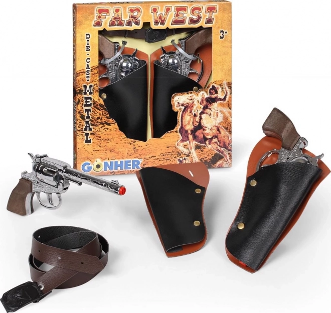 Cowboysæt fra Gonher er det perfekte tilbehør til små pistolmænd. Sættet indeholder to metalrevolvere med kapacitet til 100 skud og et praktisk bæltehylster.