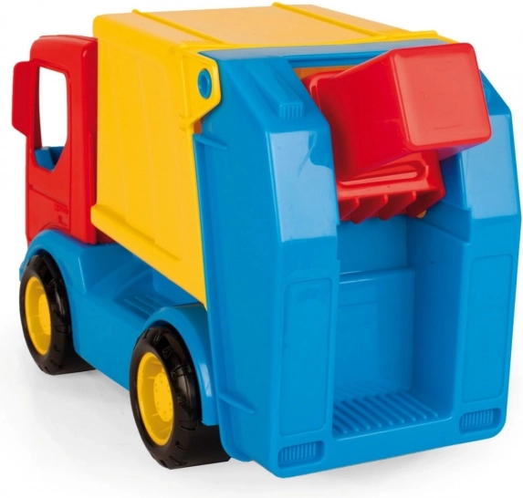 Farverig og robust Tech Truck skraldebil på 26 cm, lavet af kvalitetsplast til leg derhjemme, på stranden og i sandkassen. Har åbnelåg bagpå, bevægelig løftearm og affaldsbeholder. Udvikler finmotorik, hånd–øje-koordination og fantasi hos børn.