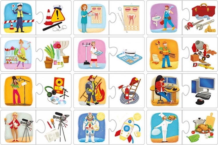 Sættet indeholder 24 puslespil, som kan samles til 12 billeder, der viser erhverv og egenskaber.