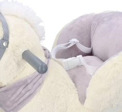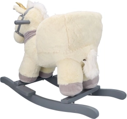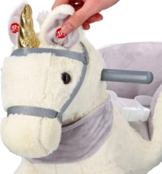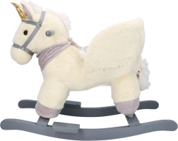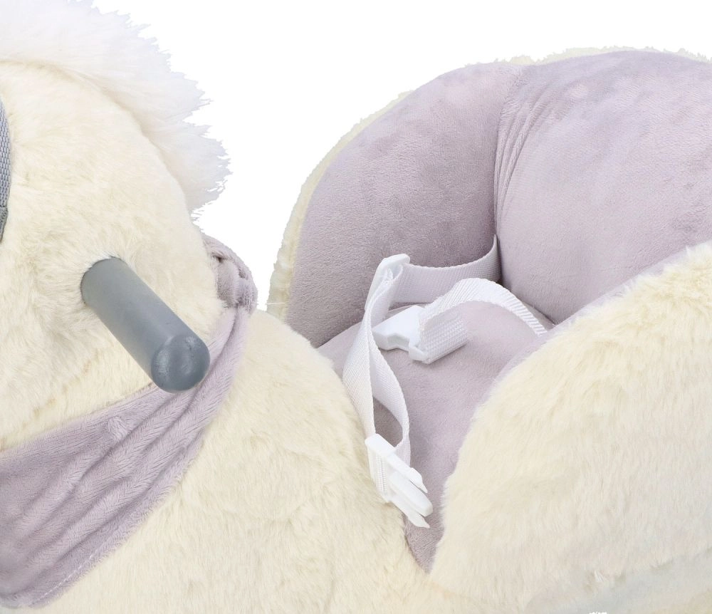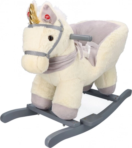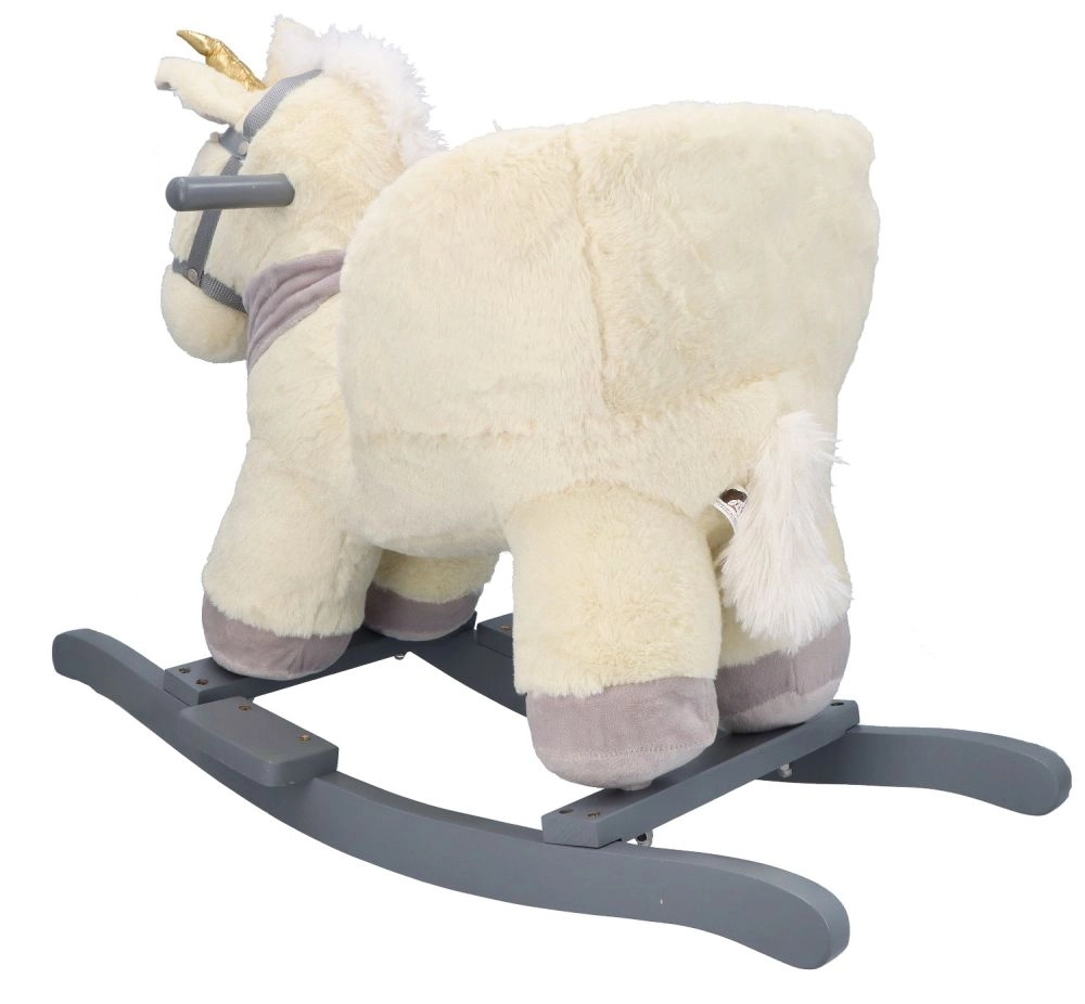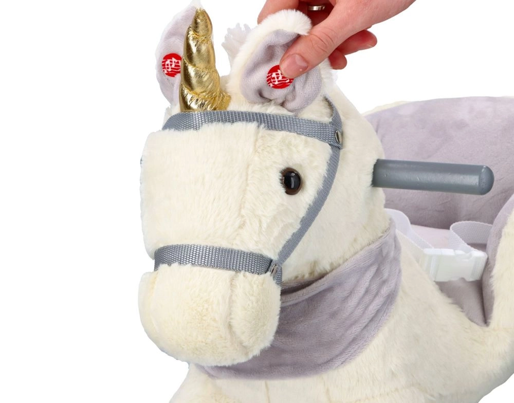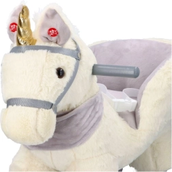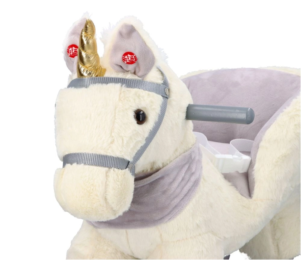 Denne plysenhjørning med gyldent horn og fine grå detaljer er et ideelt valg til hjemmeleg. Det bløde sæde med armlæn og sikkerhedssele giver komfort og stabilitet, mens træskoene og grebene sikrer en tryg og jævn bevægelse.