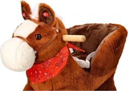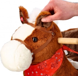 Gynghesten har en blød brun krop, hvid manke og rødt tørklæde, som giver et realistisk og venligt udseende.