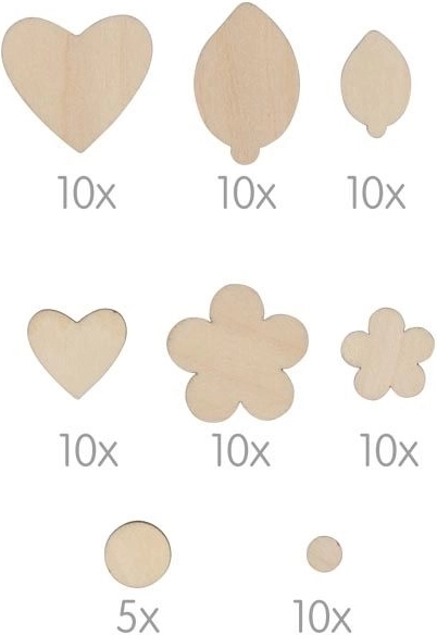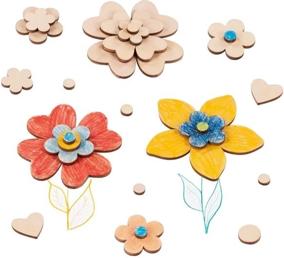 Med dette farverige sæt af træblomster kan I lave unikke dekorationer, kort, billeder og sæsonpynt. Delene i størrelser fra 7 til 32 mm er nemme at lime, kombinere og male, så børn kan udvikle både fantasi og fingerfærdighed.