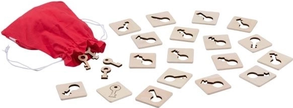 Følespillet memo Nøgler er en original observations- og sanseaktivitet, der styrker koncentration, hånd–øje-koordination og evnen til at skelne små forskelle. Spillerne trækker nøgler fra posen og forsøger hurtigst muligt at finde den matchende skabelon på træbrikken – det rigtige valg giver et point.