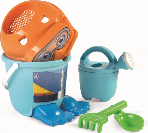 Oplev sjov på stranden og i sandkassen med et 7-delt sandlegesæt med dykker-tema. Fremstillet i Italien af kvalitetsplast, som er holdbart og sikkert for børn fra 12 måneder. Praktisk spand med en diameter på 18 cm, originalt si i form af et dykkerhoved og forme i form af svømmefødder sikrer masser af kreativ leg. Let konstruktion (0,371 kg) og komplet udstyr inklusive vandkande, skovl og rive.