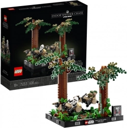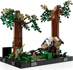 Nyd byggeoplevelsen, og skab scenen med den hæsblæsende forfølgelse på skovmånen Endor. Dioramaet kombinerer autentiske detaljer med et rent displaydesign: to speederbikes med mulighed for tilt, et par justerbare træstammer og nye bregneelementer (5/2023). Med følger minifigurer af prinsesse Leia, Luke Skywalker med grønt lyssværd og en scout-stormtrooper.
