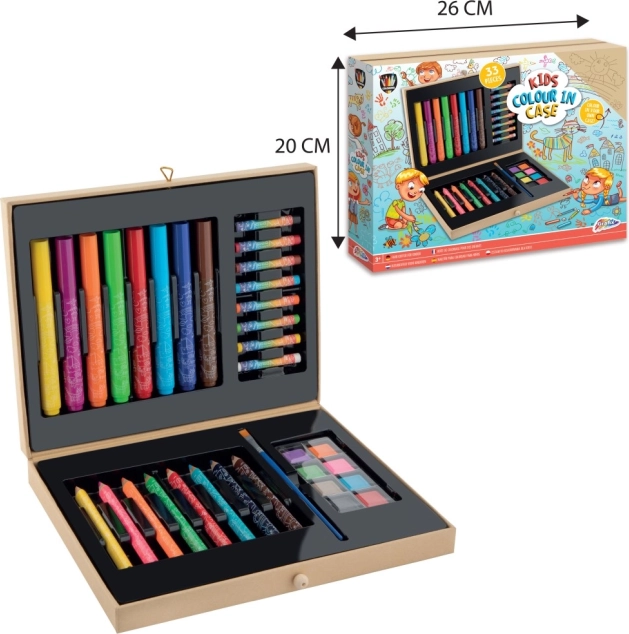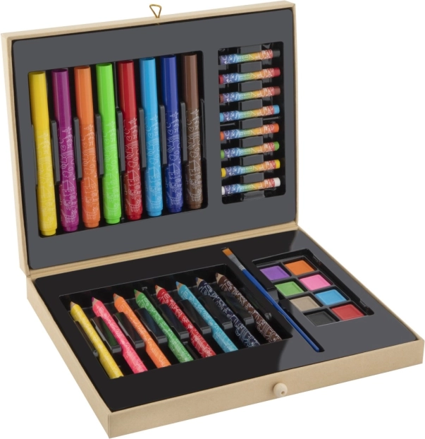 Det praktiske etui af robust karton holder alle materialer pænt organiseret og gør det nemt at opbevare og transportere. Sættet er glimrende til kreativ leg derhjemme, skoleprojekter og som gave, der vil glæde enhver lille skaber.