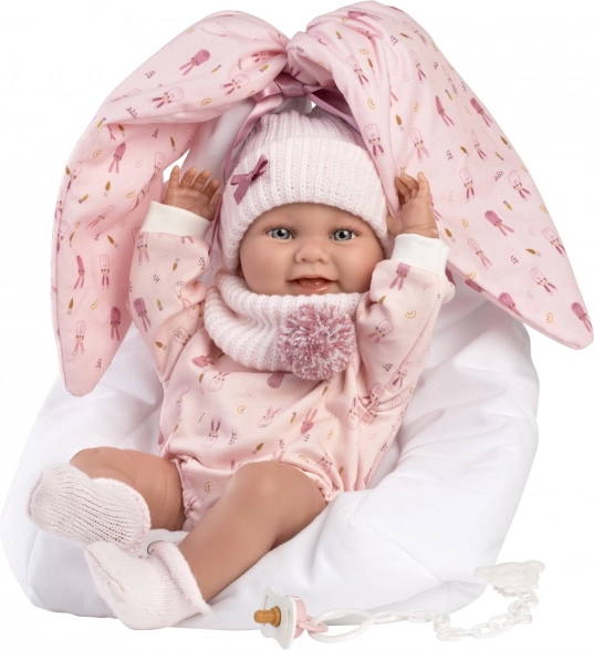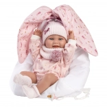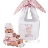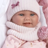 Denne realistiske dukke Llorens New Born pige gengiver en baby med fuld vinylkrop, hvor hver sød detalje er synlig. Takket være det vandafvisende materiale kan dukken bades forsigtigt (undgå at gøre øjenvipperne våde). Arme og ben er fastgjort med led, så dukken er bevægelig og kan også sidde selvstændigt.