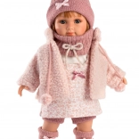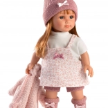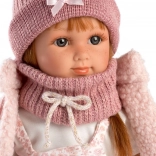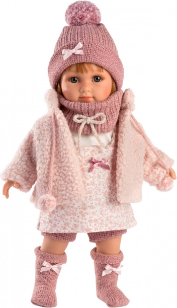 Dukken er iklædt en kjole med blomsterprint, suppleret med en strikket hat og varme sokker, hvilket skaber et livligt og muntert look.