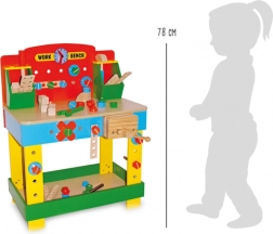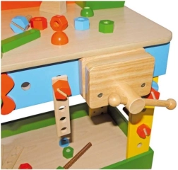 Arbejdsbænken har en robust konstruktion og rigelig plads til at skrue, bygge og lege fantasifuldt. Pakken indeholder dele og tilbehør som på billederne, så børnene kan komme i gang med at skabe med det samme.