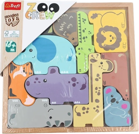 Opdag sjov og lærerig leg med træpuslespillet TREFL ZOO CREW. De robuste træbrikker i dyreform ligger godt i børnehånden, og takket være konturerne i bunden af æsken lærer børnene nemt at lægge brikkerne korrekt. Ældre børn og voksne kan øge sværhedsgraden ved at dække konturerne til eller ved at samle alle brikkerne til en firkant uden for æsken.