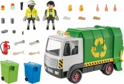 PLAYMOBIL CITY ACTION genbrugsbilen giver en autentisk oplevelse af kommunale tjenester. Børn kan læsse containere på bilens bagende, trække i håndtaget og løfte og tømme hver container. For at tømme bilen vippes hele ladet op, og det bageste påbygningsstykke hæves. Det aftagelige tag giver nem adgang til førerkabinen.