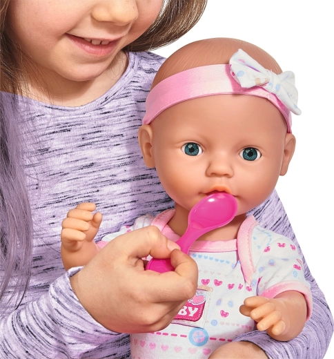 Denne funktionelle dukke i et sødt lyserød-hvidt outfit er den ideelle ledsager til daglig plejeleg. Børn kan made, give drikke, give den en sut, skifte ble og sætte den på potten. Realistiske detaljer og bevægelige øjenlåg understøtter fantasi og finmotorik.