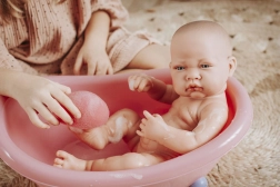 • Babyen kan bades, med forsigtighed omkring vipperne.