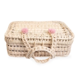 Denne håndvævede kuffert af tørrede palmeblade er smuk, let og samtidig holdbar. Takket være tekstilrum holder den alting overskueligt på plads, og børn kan nemt tage den med overalt. Det naturlige materiale og den omhyggelige forarbejdning gør den til et bæredygtigt og stilfuldt valg til børns leg.
