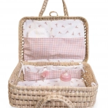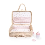 Stilfuld flettet kuffert med udstyr til dukke fra mærket ANTONIO JUAN er ideel til små omsorgsgivere. Den tilbyder praktiske rum, miljøvenlig udførelse af naturlige materialer og grundlæggende babyudstyr – flaske, sut og engangsble. Perfekt til rejser, gåture og som picnickuffert.