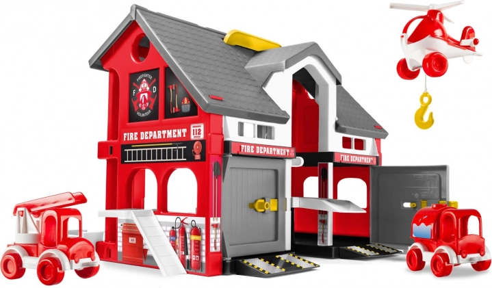 Den to‑etagers Play House brandstation efterligner trofast en rigtig redningsbase med ramper til køretøjer, rummelig hangar, transportelevator og etagen til de tjenestegørende brandfolk. Sættet inkluderer også en slukningshelikopter. Takket være den robuste konstruktion og sikre materialer er den ideel til daglig leg for børn fra 3 år.