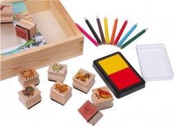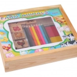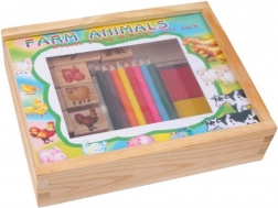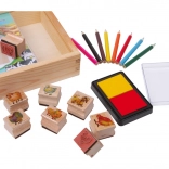 Dette sæt indeholder et bredt udvalg af stempler, der viser forskellige dyr på gården. Børn kan farvelægge hvert motiv med de medfølgende 8 farveblyanter, hvilket muliggør uendelige kombinationer af farverige design. Træboksen tilbyder den ideelle opbevaringsløsning for alt, hvad børnene har brug for til at skabe, og derfor er dette sæt også ideelt til rejser.