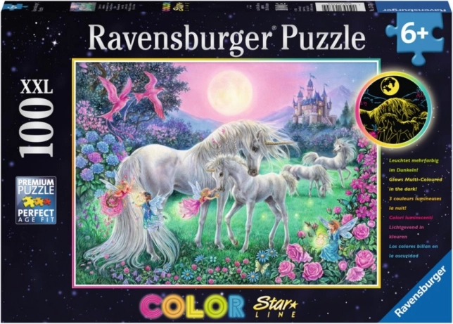 Sjovt og magisk lysende puslespil fra RAVENSBURGER med motiv af enhjørninger i fuldmåne, som begejstrer både mindre og større byggere. En special fluorescerende tryk lyser i mørket efter opladning i lys. Takket være 100 XXL brikker er det let at samle for børn fra 6 år og udvikler tålmodighed samt finmotorik. Størrelse på det samlede billede ca. 49 × 36 cm.
